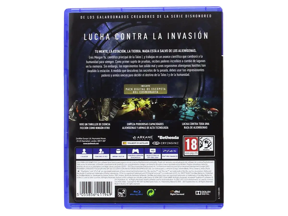 En Prey, te despiertas a bordo de Talos I, una estación espacial que orbita alrededor de la luna en el año 2032. Eres el sujeto clave de un experimento destinado a alterar a la humanidad para siempre, pero las cosas han ido terriblemente mal. La estación espacial ha sido invadida por extraterrestres hostiles y ahora estás siendo perseguido. Mientras profundizas en los oscuros secretos de Talos I y tu propio pasado, debes sobrevivir usando las herramientas que se encuentran en la estación: tu ingenio, armas y habilidades alucinantes. El destino de la Talos I y de todos a bordo está en tus manos.