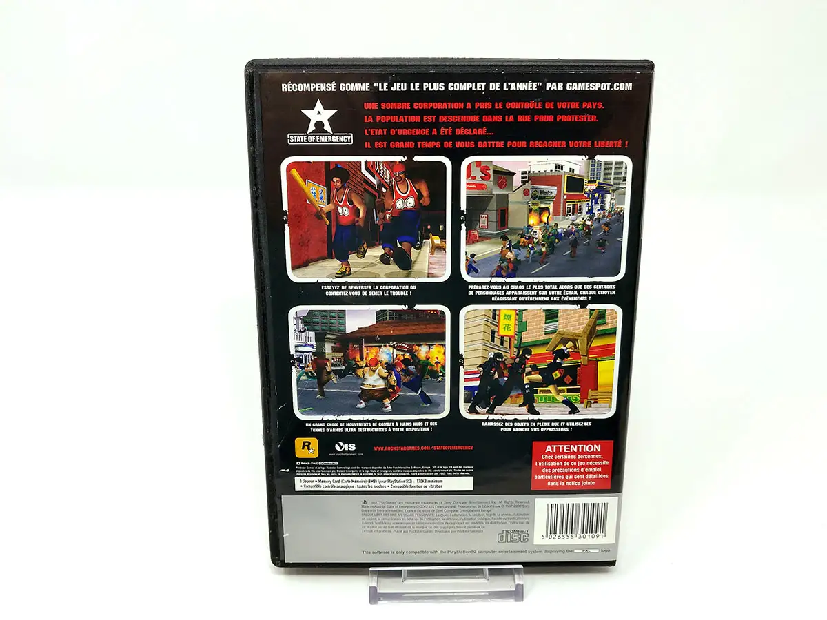 State of Emergency es un videojuego ambientado en un futuro lejano, donde todo está controlado por una corporación. A pesar de que la mayoría de las personas están felices, hay un grupo de resistencia llamado Freedom que no está de acuerdo con el régimen dictatorial de la corporación. En este juego, el jugador puede elegir entre cinco personajes diferentes: Spanky, un exmiembro de pandillas; McNeil, un ex policía descontento; Bull, un criminal en prisión; Libra, un abogado; y Phreak, un huérfano. El jugador debe completar una variedad de misiones, desde rescates hasta misiones de "matar a esta persona" o "hacer explotar esto".
